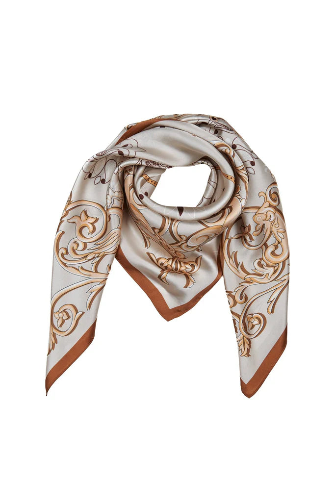 Lola Silk Scarf fra Ane Mone. Elegant silkeskjerf fra Ane Mone med nydelig mønster i nøytrale farger. Style Lola Silk Scarf rundt halsen, i håret eller på vesken for en sofistikert touch.