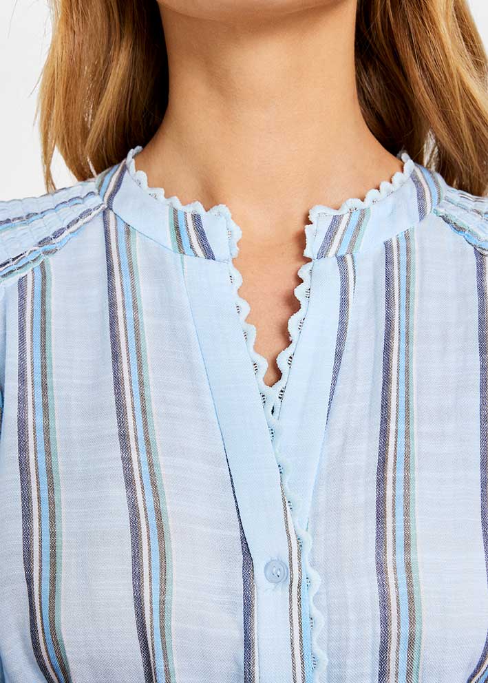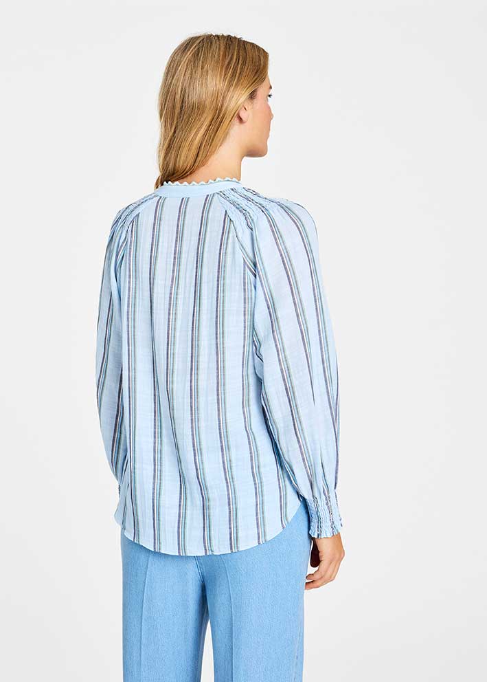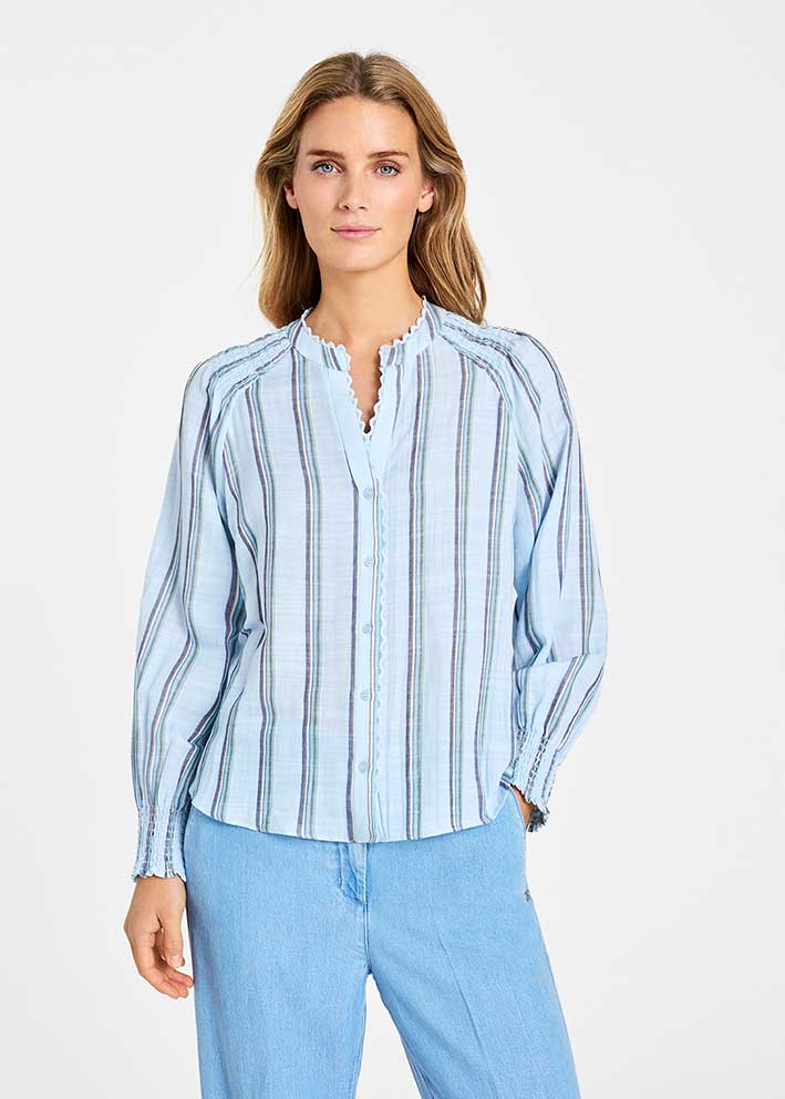 Oppdag den perfekte vårskjorten med Kora fra Gustav i den vakre Sea Breeze-fargen. Denne elegante skjorten med subtile striper gir garderoben din en frisk og moderne stemning – som en mild sjøbris på en solrik vårdag.