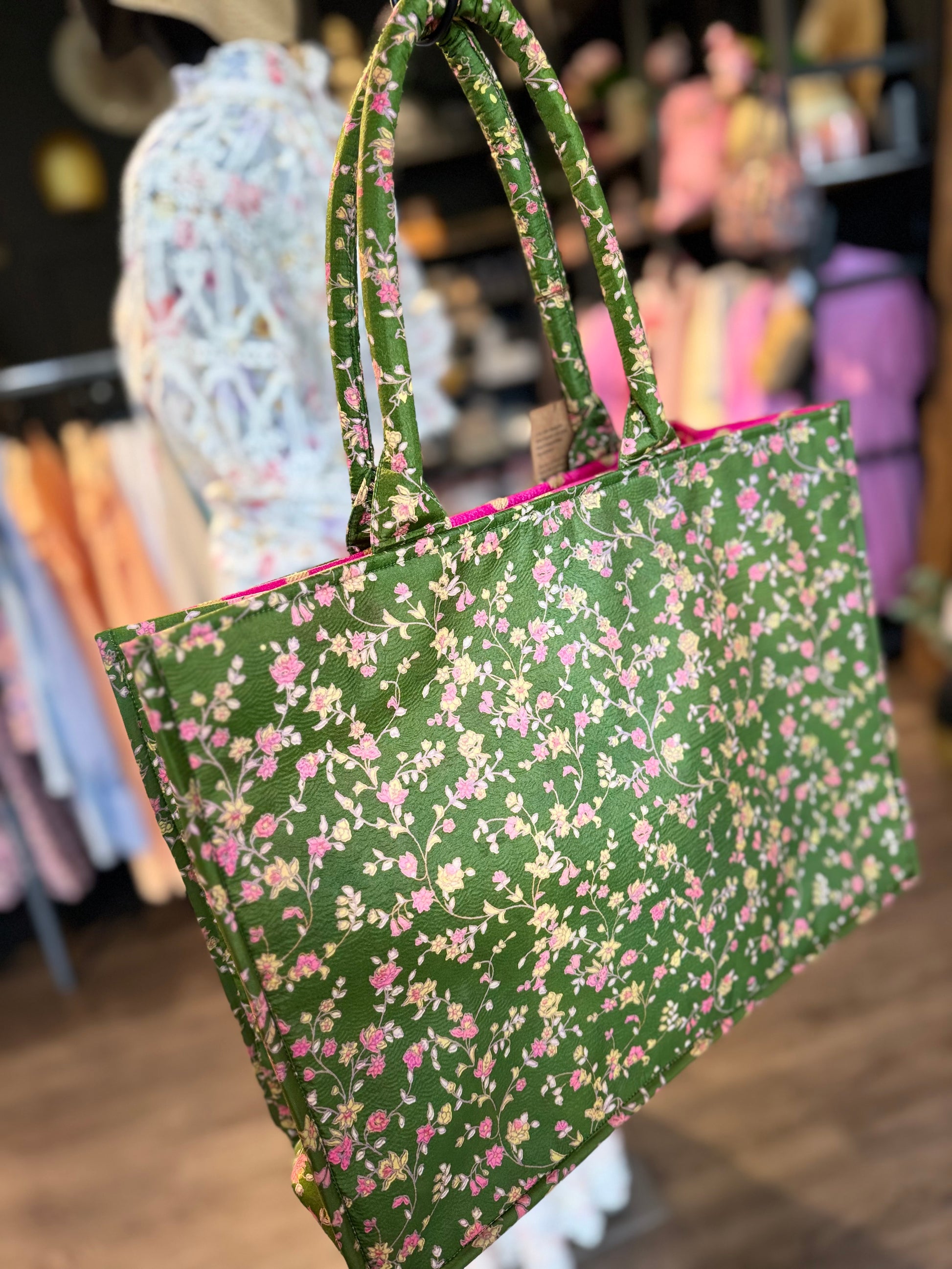 Våre vatterte handlevesker kommer i myke teksturer og livlige farger som fungerer sammen med det spesialutvalgte innerfôret. En sikker kandidat til å bli en av dine favorittvesker – på kontoret, til shopping og happy hour, samtidig som de alltid setter et stilig preg. Hver veske har en positiv sosial og miljømessig innvirkning. Alle produktene våre er laget av brukte sarier, som bidrar til å bevare planeten vår i møte med katastrofer. Størrelse – bredde: 38 cm, lengde: 41 cm, håndtaksavstand: 27 cm. Belysning og skjermer kan forårsake små variasjoner i fargeutseende.