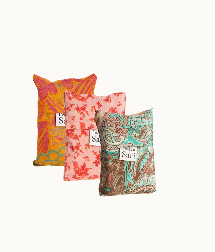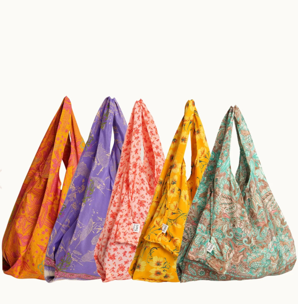 Glem aldri handlenettet igjen! Dette lette, silkemyke og sammenleggbare nettet er perfekt å ha med i vesken – alltid klart til bruk. Hver pose er håndlaget i India av gjenbrukte sarier, og bærer med seg en historie, kultur og vakker håndverkskunst.