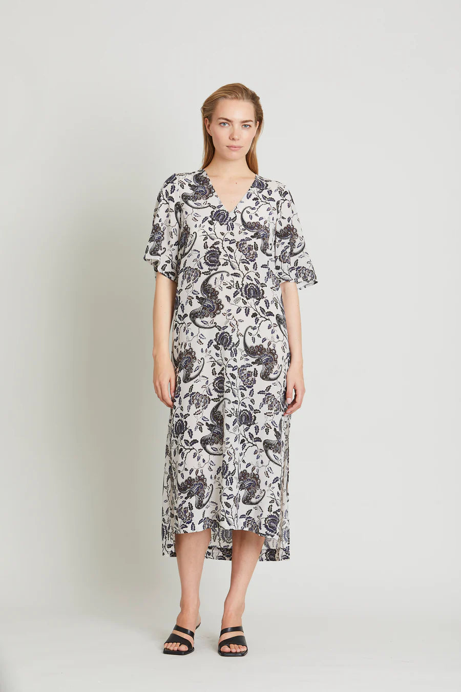 The VANEA dress is a loose-fitting dress in a beautiful print that combines comfort with style. It has wide 3/4-length sleeves that add a casual and modern look to the design.