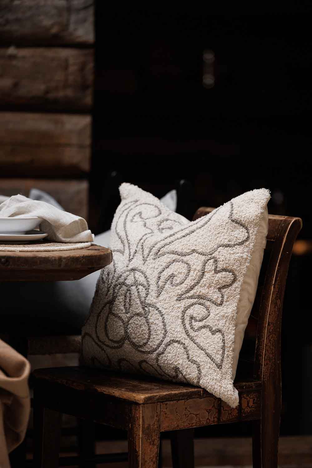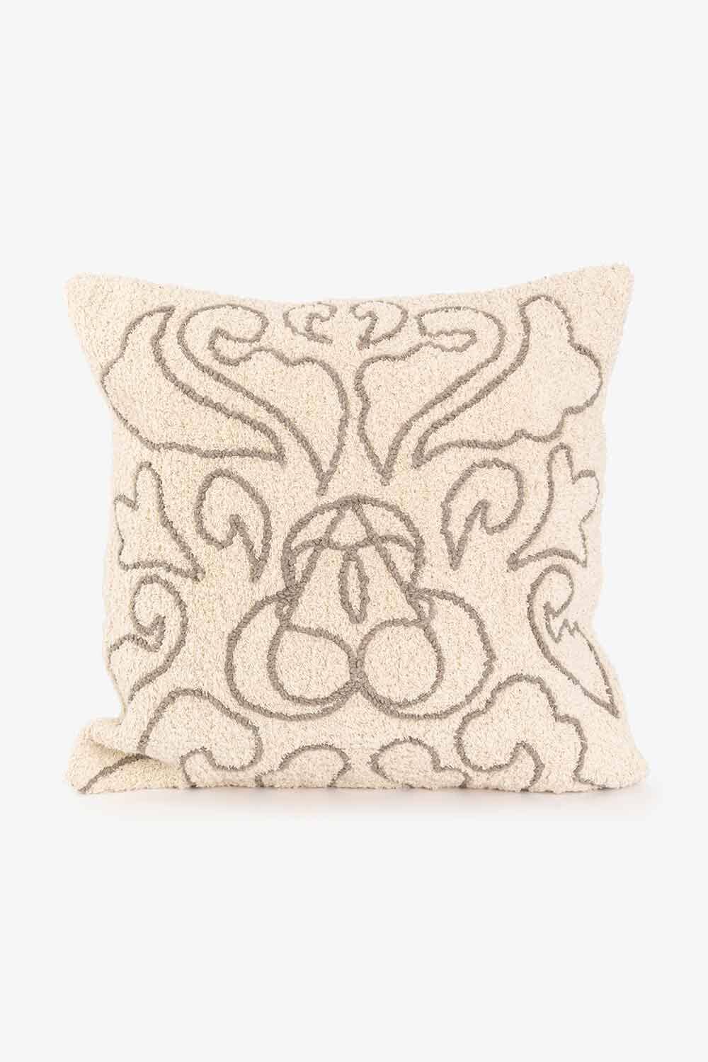 Pyntepute i mykt, naturhvitt bouclégarn av bomull med et stort, kontrastfarget mønster som diskrét inkluderer den vakre logoen til Aina Sollie Steen.
